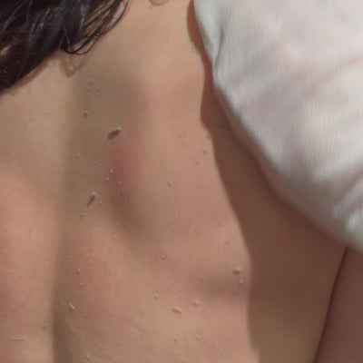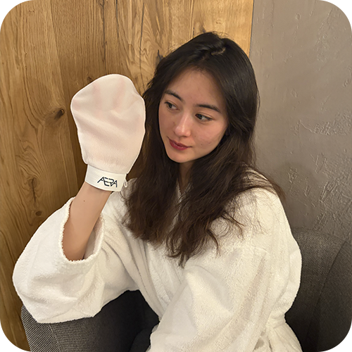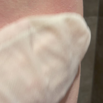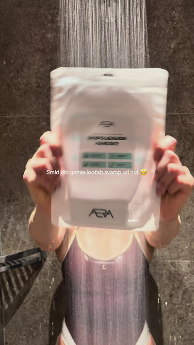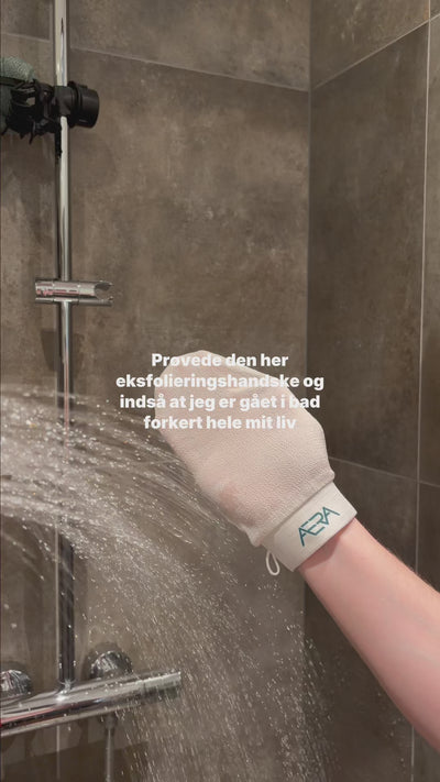 TRIN 3: Træd ud af vandet/bruseren - din hud skal blot være fugtig og ikke helt våd, ellers glider handsken bare ovenpå huden. Kør nu handsken op og ned ad huden i lange strøg. Efter lidt tid vil nogle opleve døde hudceller “rulle” af. Nogle vil ikke opleve eksfolieringen så visuelt, men bare rolig - huden eksfolieres stadig. Tilpas trykket efter behov og brug ikke handsken på sarte områder, åbne sår og betændt hud.