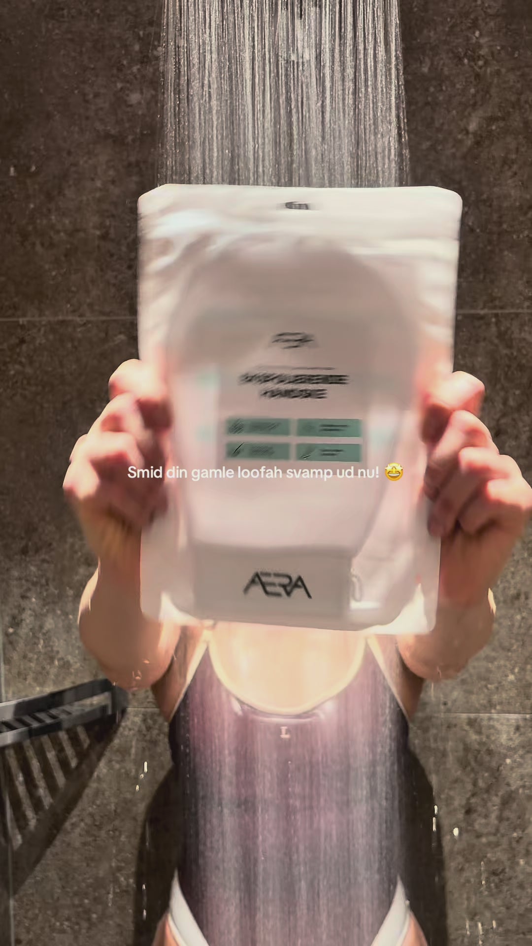 TRIN 2: Tag handsken på din foretrukne hånd og blødgør den med vandet fra din bruser. Pres overskydende vand ud af handsken, så den kun er let fugtig.